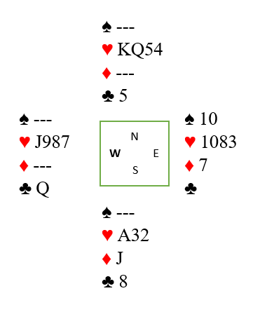 Du vet han har en stor kløver igjen og behøver ikke telle noe særlig i dette spillet, bare følge med! Det eneste du behøver følge med på er om vest kaster den kløveren du vet han har. Gjør han det tar du selvsagt kløverstikket og tre hjerterstikk til slutt. Hvis ikke vest kaster kløver (men hjerter) kvitter du deg med kløver 5 fra nord og prøver hjerteren som plutselig har til fire stikk!