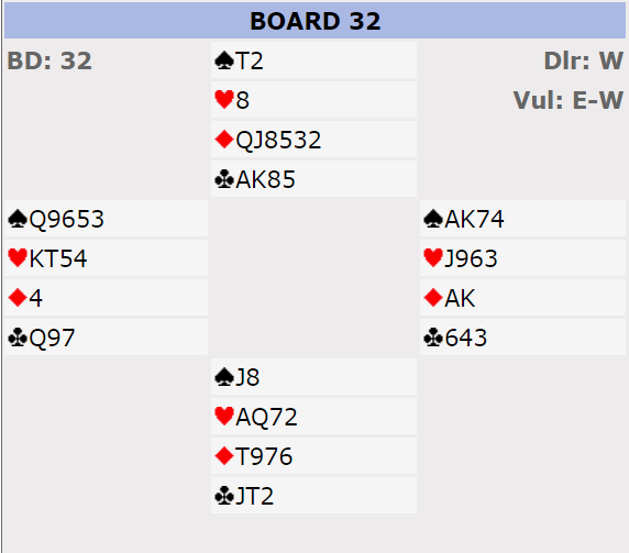 2NT viste 20-21. Noen vil kanskje være litt mer pessimistiske og kun invitere til slem med en kvantitativ 4NT (invitt til 6), men også da blir det slem fordi nord har maksimum. Det andre melde-alternativet med Puppet Stayman er fordi om nord har femkorts hjerter kan 6 hjerter på 5-3 tilpasning være en bedre slem enn 6NT. Nords 3 ruter viste en eller begge major (kun firekorts), og det var ikke syd interessert i. Så han avsluttet meldingene med 6NT. (om nord hadde hatt fem hjerter ville han sagt 3 hjerter på 3 kløver)
