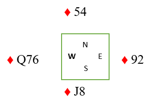 Øst får et dilemma. Hvis han legger toeren og syd lasjerer vil garantert vest fortsette fargen rett opp i syds A-J. Hvis øst legger tieren som er normalt her, kan spillefører om det ser best ut stikke, og han har en stopper med kn-8 da dette blir igjen: