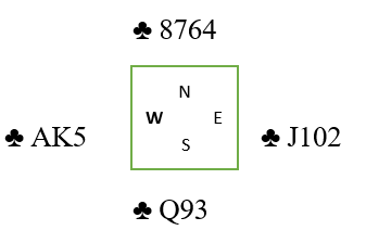 Dame-9 i kløver har blitt en perfekt saksekombinasjon, og Ø/V kan ikke lenger få mer enn ett stikk til i kløver.