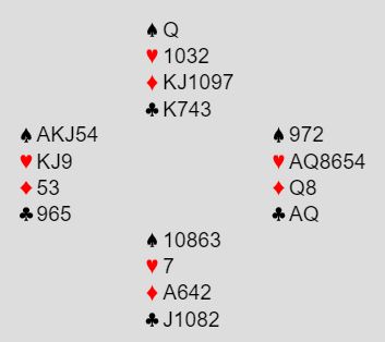 I den kampen jeg fulgte spilte syd ut kløver knekt. Det ble ingen suksess, men utspillet kostet egentlig ikke så mye. Det som skjedde like etterpå var imidlertid interessant. Slik så hele spillet ut: