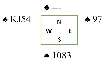 Nå kan syd dekke den første sparen fra øst, og vest vinner stikket. Så spilles kløver til øst og den siste sparen. Da legger syd liten. Fargen er blokkert for spillefører, og det er ingen flere inntak til vest! Men om syd kanskje var litt sånn i halvsøvne og hadde lagt spar 6 under esset selv om øst hadde fulgt med syveren ville fargen sett slik ut etterpå: