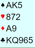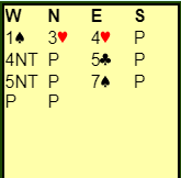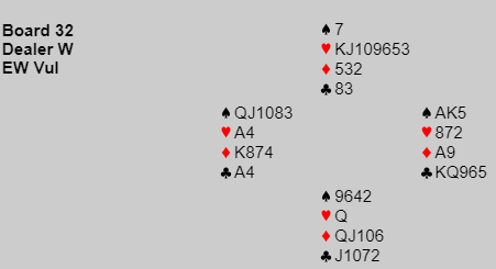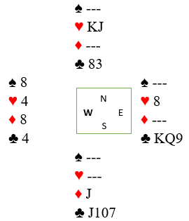 Han vant med hjerter ess, spilte spar til kongen, spar til damen fulgt av ruter ess, ruter konge og ruter til stjeing. Så spilte han seg hjem på kløver ess og tok alle trumfene. Siden nord har veldig lang hjerterfarge var det ikke noen stor overraskelse at syd var alene om både ruter og kløverholdet. Før den siste trumfen så det slik ut: