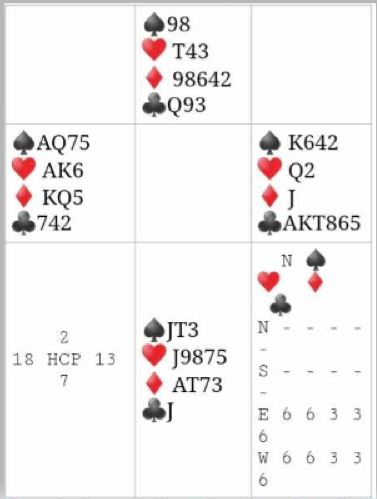 Jo, ved det bordet hadde syd åpnet med 2 hjerter som viste femkorts hjerter og minst firekorts minorfarge. Det er ni kort, og da spillefører tok noen sparrunder ble det oppdaget at syd hadde trekorts spar og nord to. Det betyr at at tolv kort kort er plassert hos syd. Og det er vel langt i fra usannsynlig at han har 5-5 i stedet for 5-4 i rødfargene, og følgelig 3-5-5-0?