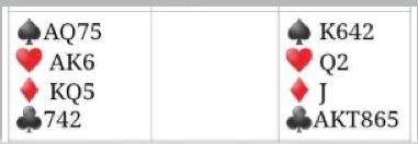 Fire par var i 6NT og to av dem gikk bet. Den ene som gikk bet fikk ruter ut fra nord til syds ess, den andre fikk hjerter ut fra nord. Utspillet spiller ikke så stor rolle i grandkontrakt, og du lurer kanskje på hvorfor ikke Ø/V spilte 6 spar?