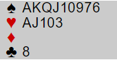Her er det ingen alternativer til åpning 1 spar eller 2 kløver, medmindre du spiller med sterk 1 kløver hvor det blir åpningsmeldingen. Det er 15 HP, men med denne type hender er det helt tullette å snakke om HP! Vest har jo ni helt sikre stikk, og særdeles gode muligheter for det tiende på egen hånd. Dette er kort som tilsier en kravåpning.