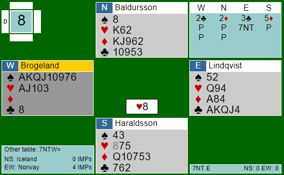I kampen mellom Norge og Island åpnet Boye Brogeland som du ser med 2 kløver. Lindqvist trodde nesten ikke det han så, og jeg tipper han først tenkte å bare si 7 grand direkte etter vests innmelding. Han tok det imidlertid litt med ro, 3 kløver - naturlig melding. Da syd meldte 5 ruter og det kom tilbake til Lindvist giddet han ikke mer av det her tullet, og sa 7 grand. Brogelands skjemtes ikke og visste at 7 grand nesten måtte stå, han la tross alt ned ni beinharde stikk som blindemann! Spillet var en formalitet, "claim" i første stikk.