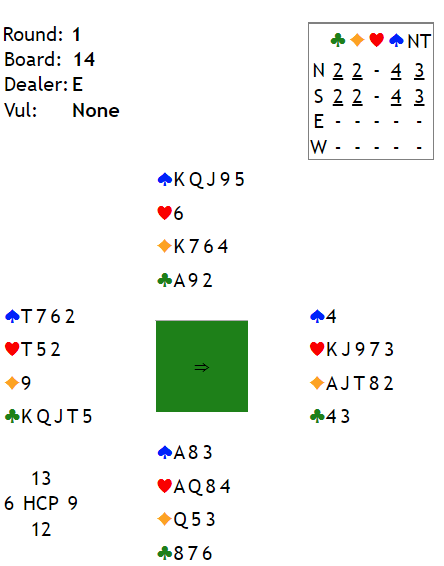 Vi tenker oss at øst spiller ut hjerter. Det koster lite å forsøke finessen nå. Ryker den så kan en kløvertaper kastes på hjerter ess senere så det blir bytting av stikk. Men hvis finessen holder ser det mye lysere ut. For om du går opp med hjerter ess blir det veldig vanskelig. Det ser i så fall ut til å bli to tapere i hver minorfarge. Så du tar hjerterfinessen, og den holder. Hvordan spiller du videre?
