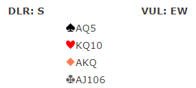 Amerikanernes meldinger startet slik, og så med søkemelding 3 kløver over "forsinket" 2 grand som viste 25-27 kunne syd finne ut om det var hjertertilpasning. Da nord ikke hadde majorfarge meldte syd 4 ruter – naturlig – og et par kontrollmeldinger senere var de i 6 ruter via Key-Card Blackwood. Det var enkelt tolv stikk der, og det ble tretten stikk siden sparfinessen gikk, +940.