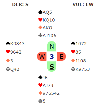 Øst spilte ut ruter konge som var en innerblink. N/S hadde 4-3 i ruter, og vest satt med ruter ess. De startet med to store ruter og ruter som øst fikk stjele. Senere hadde vest ett stikk i trumf med Q-10-x, en bet. Snakk om å gni det inn…