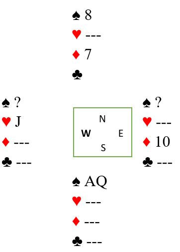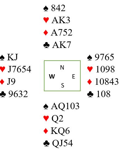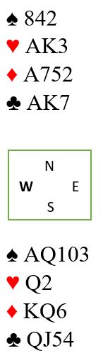 Hjerter ut til damen, kløver til esset, spar til tieren og vests knekt. Vest spiller kanskje nok en hjerter (spiller ingen rolle om han spiller hjerter, ruter eller kløver). Du kommer inn, og nå bør alle sidestikkene tas først før de to primære sjansene - fire ruterstikk eller den andre sparfinessen - kan prøves i tur og orden. Ta det tredje hjerterstikket og kast spar 3 fra syd. Så fire ganger kløver og kast en spar fra nord. Vest følger fire ganger kløver, og øst som må holde fire rutere kan ikke gjøre annet enn å kaste to spar. Så spilles K-Q i ruter og ruter til esset, vest kvitter seg med en hjerter. Sitsen i ruterfargen oppdages. Nå må det toppes opp litt og se hva vi vet. Det jo kun to kort igjen! Du vet nå at øst har igjen en større ruter enn nords syver. Du vet fortsatt ikke hvor spar konge er, men du vet at dette er den gjenværende fordelingen: