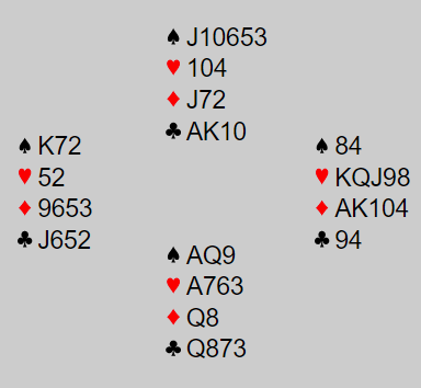 Øst doblet altså utspillsdirigerende da nord meldte den kunstige 2 rutermeldingen. Merk Siv Thoresens (vest) ultraharde 4 rutermelding med 3343 fordeling! Om N/S sier nok er nok og dobler dem i 4 ruter blir det ikke mange stikk. Kanskje går det an å få tak i fem stikk totalt, og det ville i så fall kostet 1100, litt mer enn en lilleslem som vel er normalt med N/S sine kort.