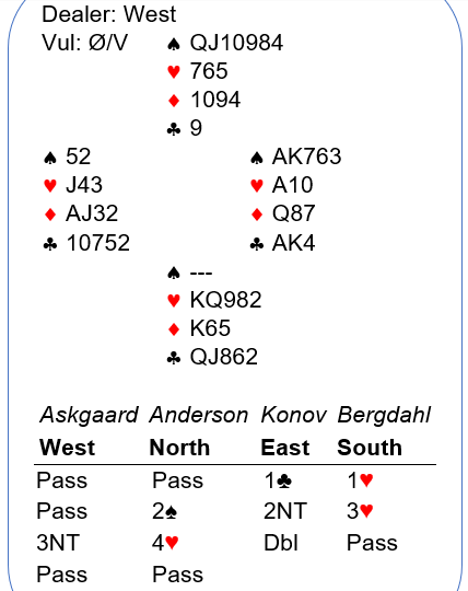 Her må det ha vært en liten misforståelse i bildet, eller kanskje ikke. At Nord ikke åpnet med en svak 2 åpning, der noen åpnet med 3 spar i de gunstige soneforholdene er overraskende. Konovs 1 kløver var sterk og kunstig, og etter Syds innmelding og makkerens hopp tror jeg ganske sikkert han oppfattet nords hopp til 2 spar som støtte siden nord ikke hadde sagt noen i første melderunde. Det stemmer jo ikke at han kun har lang spar og svake kort? Hoppet er antagelig definert som støtte i hjerter og sparfarge, og det har han jo for så vidt. Konovs 2 grand var naturlig, og Syd som visste om hjertertilpasning presset på med 3 hjerter. Det var nok til at nord stampet over vests 3 grandmelding.