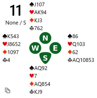 Mot 5 ruter spilte Heskje ut sin single kløver til esset fulgt av den minste kløveren (Lavinthal) tilbake til stjeling. Vest skiftet til hjerter. Spillefører kunne ikke unngå å tape ett stikk til spar konge senere. En bet altså, og sammen med +460 ved det andre bordet var det verd 11 IMP.