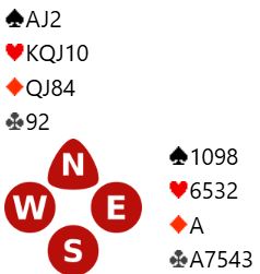 7NT er ingen dårlig kontrakt det heller. Om det er fem ruterstikk er det 3+1+5+4 = 13 enkle. Så 7NT står om ruteren sitter 3-2, knekten singel hos nord eller knekten fjerde hos syd. Det kan også bli tretten stikk om syd har alle de fem uteværende ruterne. Da blir det kun fire ruterstikk, men det trettende kan komme via hjerterfinesse, eller en skvis mot syd om han/hun har fem rutere og hjerter konge.