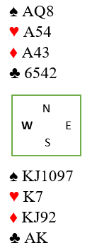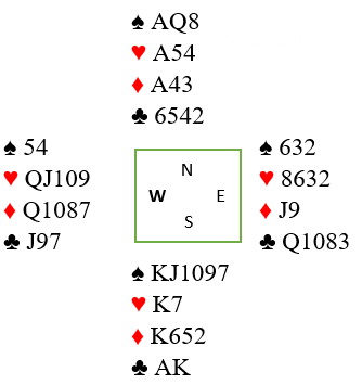 Dette er et spill av typen «Hva i all verden kan gå galt her?», for det ser nokså trygt ut i 6 spar. Men sees litt nøyere etter så er det et faremoment, det kan bli to rutertapere. Og her er altså den fargekombinasjonen vi nettopp gikk gjennom. Hvis dette hadde vært grandkontrakt ville kongen fulgt av liten til esset, så liten mot knekten dobbel vært riktig spill for å maksimere sjansen for tre ruterstikk. Det kan dog koste et overstikk da det kan være tretten stikk å hente med snill sits, men i lagkamp ofrer vi gjerne det for å ha størst mulig sjanse til å vinne vår kontrakt.