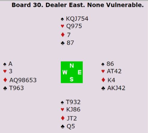 Englands øst svarte 2 kløver. Vest sa 2 ruter som antagelig var en slags hvilemelding, Øst viste hjerterfargen, og vest støttet. Jeg kjenner ikke detaljene i det engelse parets system, men etter den starten endte de i slem.