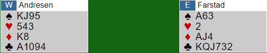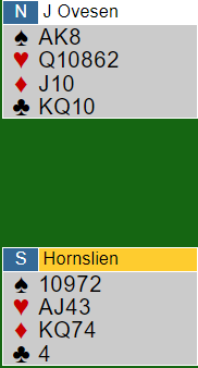 Ovesten spilte hjerter til esset og mer hjerter. Ved det andre bordet tok spillefører trumffinessen. Slik så hele spillet ut: