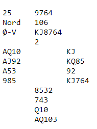 Det er naturlig å havne i 4 hjerter. Systemet avgjør om vest eller øst blir spillefører. De som svarer naturlig over 1 kløver (øst) svarer 1 hjerter, og vest blir spillefører. De som bruker kløverføringer svarer 1 ruter som viser hjerter, og øst blir spillefører. Det kan være nokså tilfeldig hva som er best i det enkelte spill, men her var det noe enklere å spille 4 hjerter som øst fordi da måtte syd spille ut.