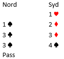 Dette interessante spillet dumpet ned i mailboksen her om dagen (takk til Ole Jonny Tøsse). Det er fra en 3.rundekamp. Spillet har et godt poeng i motspillet, men også hvordan meldingene bør gå kan i høyseste grad diskuteres.