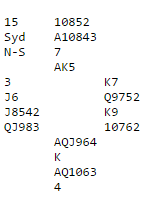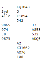 I dette spillet fra den turneringen Grime-Allard vant kom de i beste kontrakt slik det satt, noe som ga "en bøtte" med IMPs.