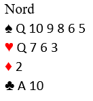 Ved det ene bordet stoppet N/S i 4 spar. Ved det andre kom N/S i 5 spar. Vest skulle spille ut og valgte sin single hjerter. Nords hånd kom opp som blindemann: