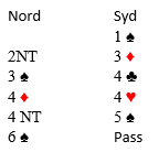 Ved begge bord overførte nord til spar etterfulgt av en kontrollmelding, ved det ene bordet 4 kløver, ved det andre bordet 4 ruter! Er overføring fulgt av melding på firetrinnet kontrollmelding etter 2 grandåpning?