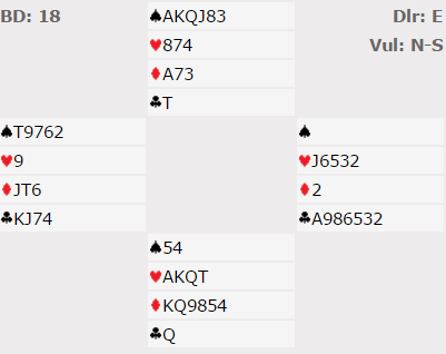 Seks par fant frem til 4 spar. Ved tre bord ble det spilt 3 grand, kun ved ett av dem ble utgangen vunnet. Ved resten av bordene ble det spilt delkontrakt. Det skjedde nok ved at nord over syds gjenmelding 2 ruter tok det forsiktig og løftet til 3 ruter, og syd ga opp selv med 14 hp da han syntes det var litt for langt frem til 5 ruter.