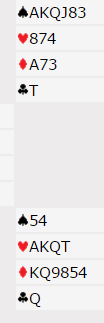 Etter at vest hadde åpnet med 1 kløver endte jeg som nord i 4 hjerter. Kløver konge kom i utspill til esset. Det så ut som fare for at hvis de kom inn før trumfen var tatt ut så ville det komme kløver og mer kløver fra vest slik at trumfhøyning truet. Men det hjelper ikke å ta ut trumfen, for da er blindemann en ørken, ingen inntak til kløveren, og det vil bli to rutertapere og en taper i hver av de sorte fargene. Så inntakene til nord må brukes til å spille ruter, og hvis den trumfhøyningssituasjonen jeg nevnte oppstår må hjerter knekt sitte høs vest. Så kløver ess vant første stikk fulgt av ruter til tieren og østs dame. Det kom spar til esset og mer spar. Her gjorde faktisk vest en feil, han skulle tatt for kløver dame først (kløveren kan ikke utnyttes uansett siden øst har fire trumf). Hvorfor han burde tatt for kløver dame vil du få se om litt. Inne i andre sparrunde ble hjerter konge spilt, så hjerter til esset. Dette var igjen: