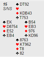 Det var ikke så unaturlig å ende i 4 hjerter som Ø/V, normalt en bra kontrakt . Men med den fæle trumfsitsen var det ikke så lett etter ruter konge i utspill. Vidar Smith vant den likevel etter nøyaktig spill, bl.a må  utspillet lasjeres. Senere oppdages hjertersitsen etter liten mot A-J, og syd får ikke mer enn to hjerterstikk. Vests andre rutertaper kastes etter hvert på østs fjerde kløver.