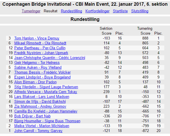 I hovedturneringen - Copenhagen Bridge Invitational ble det som tidligere nevnt 6. og 9.plass til henholdsvis Helness-Helgemo og Brogeland-Lindqvist.