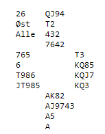 Jeg er «ess-utspiller» mot slem selv om jeg saktens kan innrømme at det ikke alltid er blink. Selv om det av og til gir dem kontrakten er det trolig oftere at du enten kan bete slemmen med essutspillet (får tak i det stikket før taperen deres forsvinner), eller at det er gullkantet i parturnering å få fatt i det ene stikket før det er for sent, i stedet for gi dem overstikk. Slik så hele spillet ut: