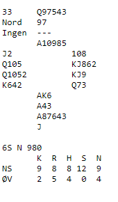 Vinnerparet hadde (kanskje) en sjanse til å la motparten spille delkontrakt, men de var med til 3 kløver som Ø/V (vest spillefører). N/S var tøffe, og de doblet denne kontrakten. I 3 kløver mister man litt kontrollen siden trumfen sitter 4-1. Det endte med +500 til N/S. Det resultatet var imidlertid kun litt under middels for Knut og Per, mange hadde høyere score N/S i utgang, og/eller doblede kontrakter som føk hjem. Toppen gikk til Håkon Gjeterud-Tor Gjone som noterte +1190 for 4 hjerter doblet med tolv stikk! Hvor det tolvte stikket kom fra kan man bare gjette seg til, og min gjetning går i favør av ruter 5 etter at motparten, oppgitt over at den doblede kontrakten var i ferd med å fyke hjem forsaket seg?