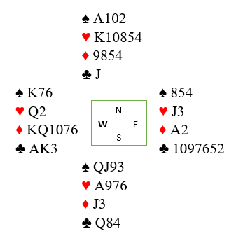 Øst åpnet ved mange bord med 1 grand (15-17). Idet motparten åpner med en sterk grand, er det ikke så lett å komme i utgang. Og det er vel heller ikke ofte egen side har utgang, men i dette tilfellet er det gode muligheter både i 4 hjerter og 4 spar!