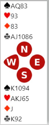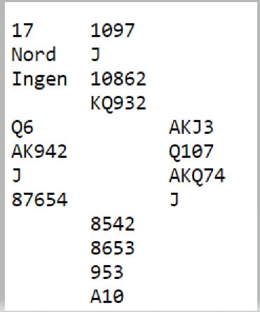 I neste stikk skjer det noe litt overraskende slik alle kortene så ut (som du snart skal få se), nord spiller ruter dame, øst kaster kløver 5 og syd legger liten ruter. Det er din tur. Hva gjør du?