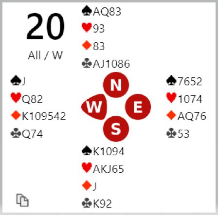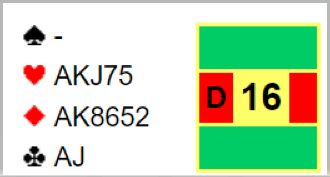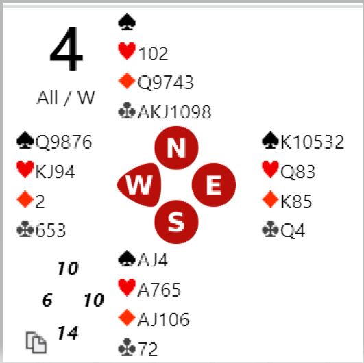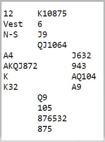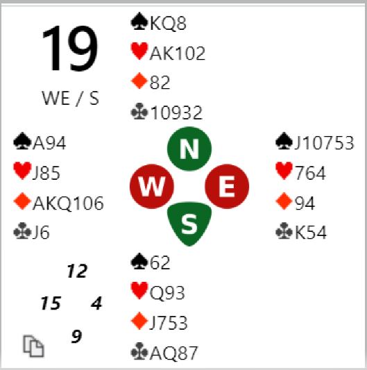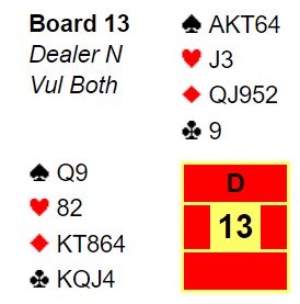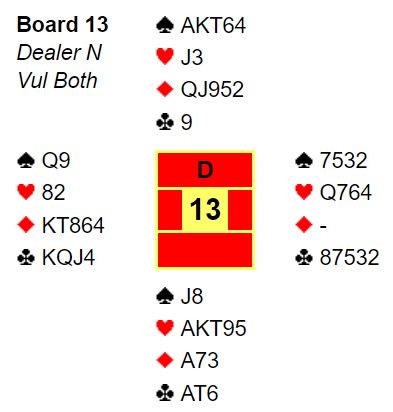 For de med vanlig system starter det med et valg av åpningsmelding for vest, 1 hjerter eller 2 kløver. Nord melder antagelig inn over 1 hjerter selv om N/S er i ugunstig sone. Da viser vel øst en invitthånd og hjerterstøtte med et cueraise, og vest går på mot slem. Det er imidlertid ikke helt klart hvordan finne ut med sikkerhet at det er tretten stikk. Øst må ha ruter dame (eller kløver dame) for at det skal være 13 opplagte stikk. Eller hvis ikke øst har en minordame kan han ha dobbelton kløver som i hjerterkontrakt gir ett ekstra trumfstikk med stjeling på den korte trumfhånden.