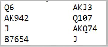 Når du vet hva en skjult hånd har (her øst) i en farge vet du også eksakt hva den andre skjulte hånden har (her syd). Øst er altså renons i ruter, så syd har trekorts ruter med esset på topp. Dermed er hele fordelingen klar: syd har dobbel spar, femkorts hjerter, trekorts ruter og dermed kun trekorts kløver. Du kan vinne for ruter konge og rett og slett ta kløverstikkene, og du beter 4NT. Slik så spillet ut: