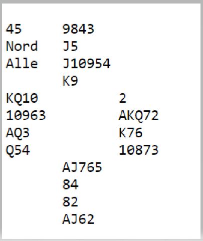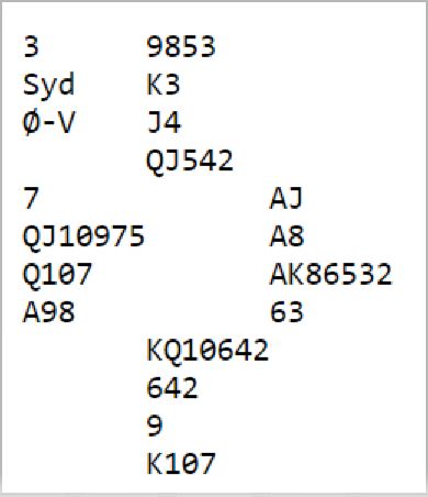 Vest halvsov imidlertid og lå unna med ruter konge, uvisst av hvilken grunn da det er vanskelig å se hva motspillerne kan tjene på det. Og vest kunne som sagt tatt beten og visste egentlig det og om hun hadde fulgt med. Etter ruter dame vant stikket tok spillefører direkte finesse i hjerter med knekten la løpe og kunne gjenta den finessen for fem hjerterstikk så han noterte til slutt elleve stikk.