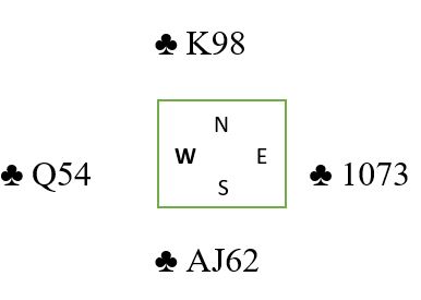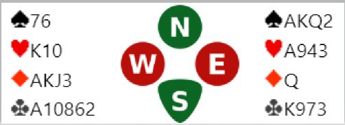 Vel, det kan bli to kløvertapere og bet i lilleslem om man er riktig uheldig. Hvis en honnør legges ned fra det som viser seg å være feil side fordi han bak den andre honnøren har alle fire uteværende kløverne tapes to kløverstikk (om ikke det er en veldig heldig fordeling til så en kan få til innspill for å unngå to tapere i fargen). Det er imidlertid en klassisk safespilling til rådighet her, men da tapes ett stikk hver gang det er tretten stikk, men du får kun tolv.