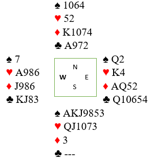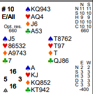 Nå ble en hjerterfinesse tatt, og syd vant for å kunne ta sine to kløverstikk. Forsvaret hadde allerede fire stikk. Dette var igjen: