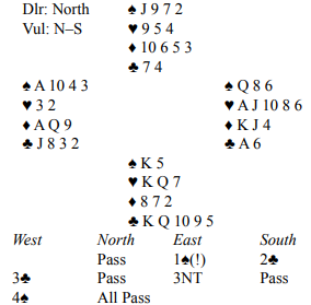 Høyeste kontrakt som kan vinnes er 4 kløver av Ø/V. N/S kan kun vinne 3 spar! Plus 130 til Ø/V er maksimum score, men nesten hele feltet vinner utgang N/S!
