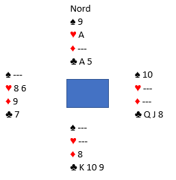 Etter to runder trumf spiller han på hjerteren. De får to hjerterstikk, men en liten hjerter kan om ndøvendig trumfes hos nord, og syds hånd er bare ståstikk – fem trekk.