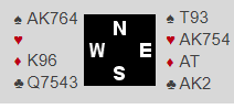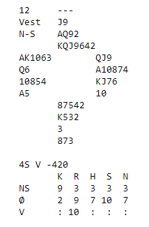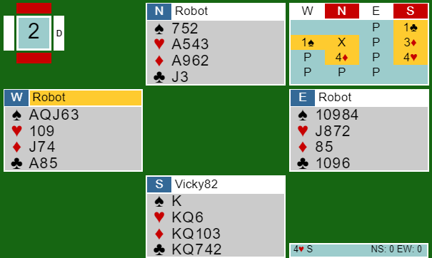 Roboten på nords plass doblet negativt over vest sin 1 spar-innmelding, og Vicky viste sterke kort med 3 ruter. Da Roboten løftet til 4 ruter foreslo Vicky 4 hjerter, og det ble sluttkontrakten.