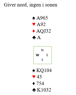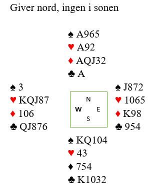 Det handler om å unngå at nord får komme inn slik at hjerter kommer gjennom, for hjerter ess befinner seg mest sannsynlig hos syd. Gullkortet her er ruter knekt som bør være nok til at en erfaren spiller kjenner igjen poenget. En god start er å stikke med ruter ess og spille ruter knekt med det samme, og på det kortet kastes en kløver fra øst! Etter den starten er det enkelt, kløveren kan godspilles og det blir elleve stikk.