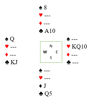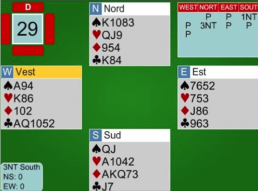 De som vant 3 NT stakk med spar knekt i stikk en og spilte ruter dame til kongen og esset. Så ruter til knekten og mer ruter. Syd kom heldigvis inn og spilte spar. Spillefører stikker den med esset og kan spille liten hjerter mot damen. Her kan det virke naturlig å spille hjerter dame fordi spillefører fortsatt er "redd" for den sårbare kløverfargen og ikke vil risikere at nord kommer inn hvis han har hjerter konge. Men kan det aldri bli mer enn to hjerterstikk. Hvis hjerter dame spilles kan det fortsatt lykkes med et skvisinnspill mot syd, men da en litt mer koplisert sluttposisjon enn det som i def følgende beskrives.