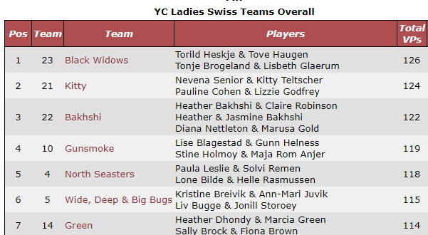Norsk seier viser igjen den solide fremgangen for norske damebridge de senere årene. Det blir stadig flere gode resultater internasjonalt. Det bekreftes i helgen også ved at det var et helnorsk lag også på 4.plass: Lise Blågestad, Gunn Helness, Stine Holmøy og Maja Rom Anjer. Sølvi Remen spilte på et dansk-engelsk-norsk lag som ble nr. 5 og på 6,plass finner vi nok et norsk lag bestående av Kristine Breivik, Ann-Mari Juvik, Liv Bugge og Jonill Storøy.
