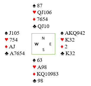 Det ser ut til at en spartaper ikke er til å unngå, og derfor at taper i trumf må unngås. Det går som du ser ikke siden øst har kongen dobbel. Men Lauritsen fant varianten etter hjerter ut til esset. Han splilte kløver til esset fulgt av tre runder ruter. Så ble øst spilt inn og måtte gi sparfavør. Østs alternativ er å spille ruter, men da trumfer spillefører hos syd og kaster spar 10. Det ble altså den uungåelige trumftaprern, men den tilsynelatende uungåelige spartaperen forsvant!