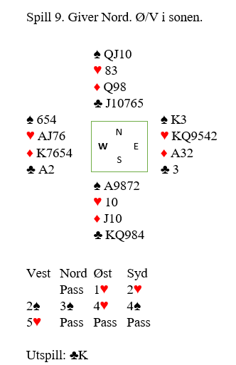 Etter syds Michaels Cuebid (minst 5-5 i spar og en minorfarge) fant N/S en god stamp i gunstig sone. Ø/V valgte å satse på at 5 hjerter står.