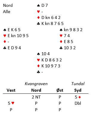 Her klaffet systemet godt for Tundal-Kvangraven. Deres 2 grandåpning viser nemlig begge minor, konstruktiv hånd. Dermed kunne syd sperre kraftig med det samme. Det er sannelig ikke lett når man må begynne å melde på femtrinnet!