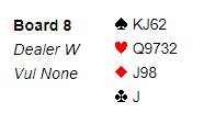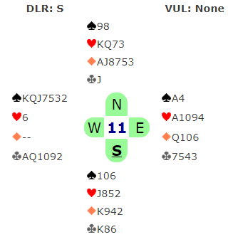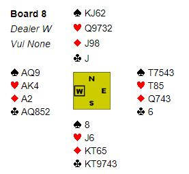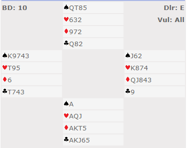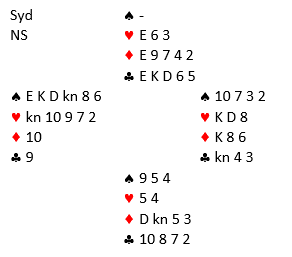 Så jeg ga opp eliminasjonen og fridde meg med kløver, men syd stakk og spilte spar som måtte stjeles mens det ble fulgt på med den siste sparen fra øst. Hjerteren måtte løses uten taper, og etter esset ble det spilt liten til knekten med magert resultat, syd tok betestikket med hjerter dame.